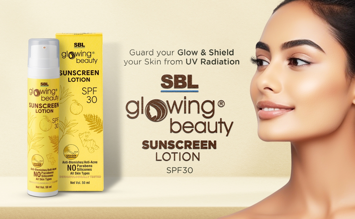 SBL Glowing Beauty Sunscreen Lotion is a lightweight formula that absorbs easily into the skin, leaving behind no greasy residue.