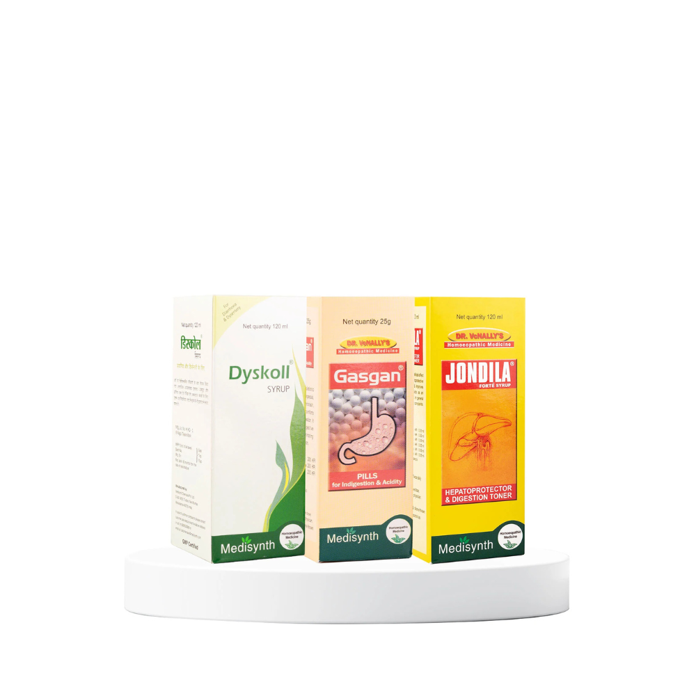 Irritable Bowel Syndrome (IBS) Care Kit contains Dyskoll Syrup(120ml), Gasgan Pills(25g), and Jondila Forte Syrup(200ml) 1 quantity each.