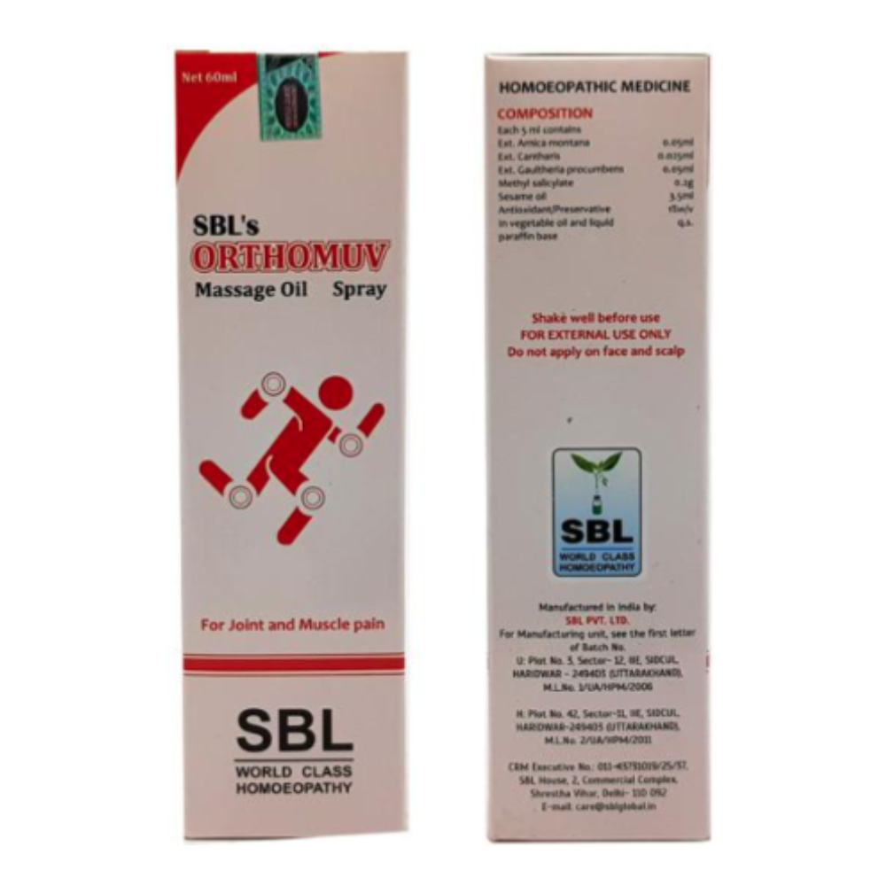 SBL Orthomuv Massage Oil Spray offers a safe, natural, and soothing way to manage joint and muscle discomfort. Whether you are experiencing arthritis, muscular strain, or simple stiffness from overexertion, this spray aids in providing gentle relief. By combining deep penetration with circulation-supporting effects, it helps restore comfort, mobility, and strength, making it a trusted choice for those seeking holistic musculoskeletal care.