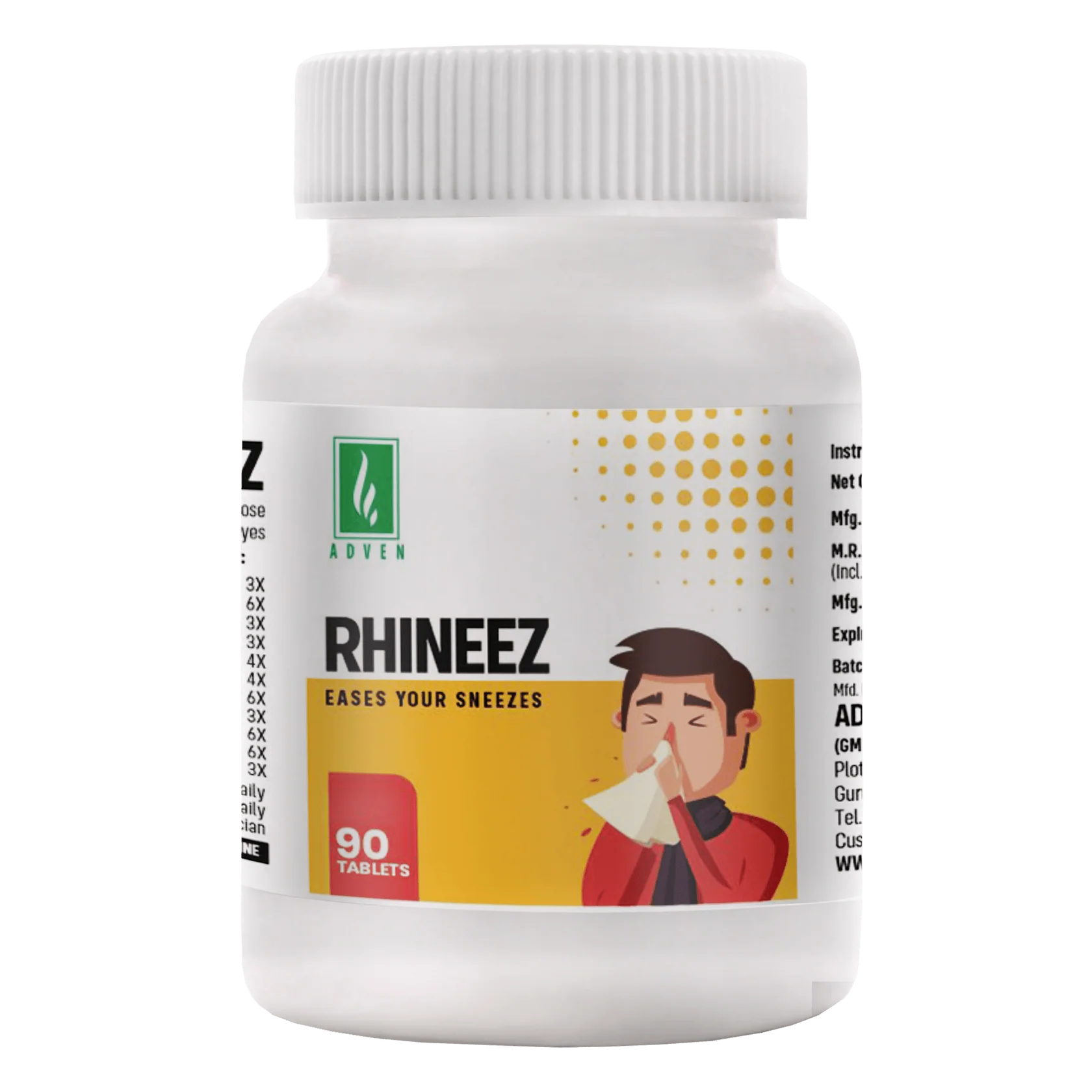 Adven’s Rhineez tablets help alleviate symptoms of rhinitis, including nasal congestion, runny nose, sneezing, watery eyes, and itching. It acts on the mucus membranes of the upper respiratory tract, reducing congestion, body aches, and raised body temperature. It is effective for various types of rhinitis, such as acute, allergic, and non-allergic rhinitis.